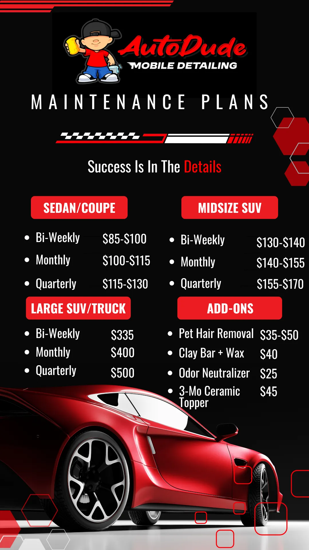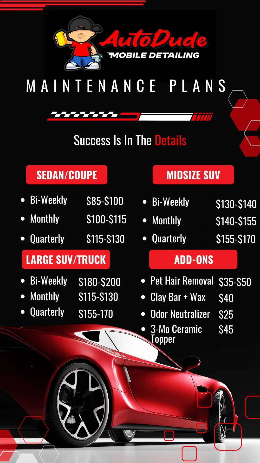 Our maintenance wash plans are designed for clients who want to protect their investment, save time, and enjoy that freshly detailed look all year long. These plans are available after an initial full detail to ensure your vehicle starts from a clean baseline.