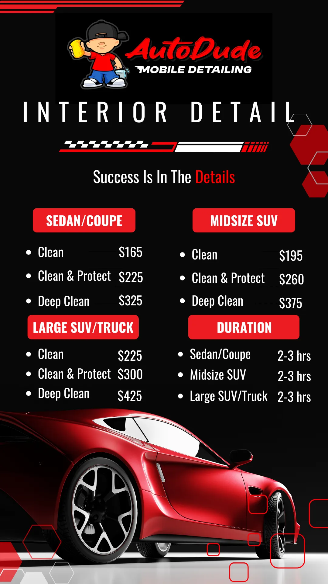*Prices Shown By Vehicle Size and Package Type - Clean/Clean & Protect/Deep Clean